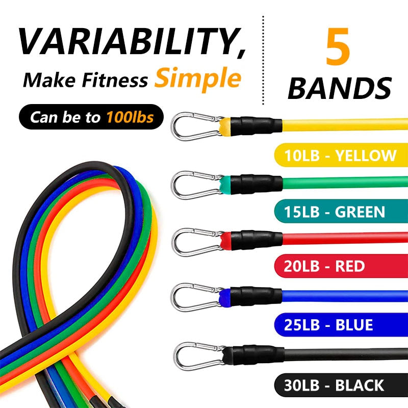 Our set includes five different resistance bands, each with a different level of resistance, so you can progress as you get stronger. The bands are also versatile, allowing you to use them for a wide range of exercises. They are lightweight and portable, so you can easily take them with you on the go, whether you're traveling or working out at home.
